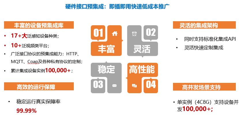 迄今米兰·(milan)中国公司已经预集成17+大泛感知设备种类,10+泛视频类平台,广泛接口协议的预集成能力涵盖了HTTP、MQTT、Coap及各种私有协议的定制,累计集成设备实例达100,000+。它还支持标准化集成API,可灵活快速地定制集成,通过构建规则引擎,实现了各设备间的联动应用,比如检测到违规停车,联动广播就会自动播报提醒,为社区管理服务赋能。